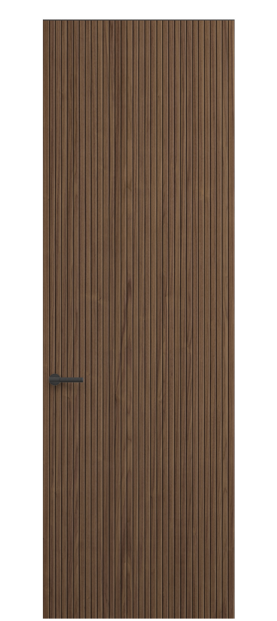 SELECT — коллекция минималистичных дверей с фрезеровкой по натуральному шпону. Рельеф на поверхности полотна создаёт игру света и тени, добавляя пространству динамичности и визуального объёма. Двери SELECT в сочетании со стеновыми панелями и мебельными фасадами, повторяющими лаконичный дизайн, создают единое стилевое решение.