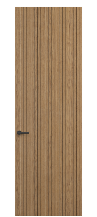 SELECT — коллекция минималистичных дверей с фрезеровкой по натуральному шпону. Рельеф на поверхности полотна создаёт игру света и тени, добавляя пространству динамичности и визуального объёма. Двери SELECT в сочетании со стеновыми панелями и мебельными фасадами, повторяющими лаконичный дизайн, создают единое стилевое решение.